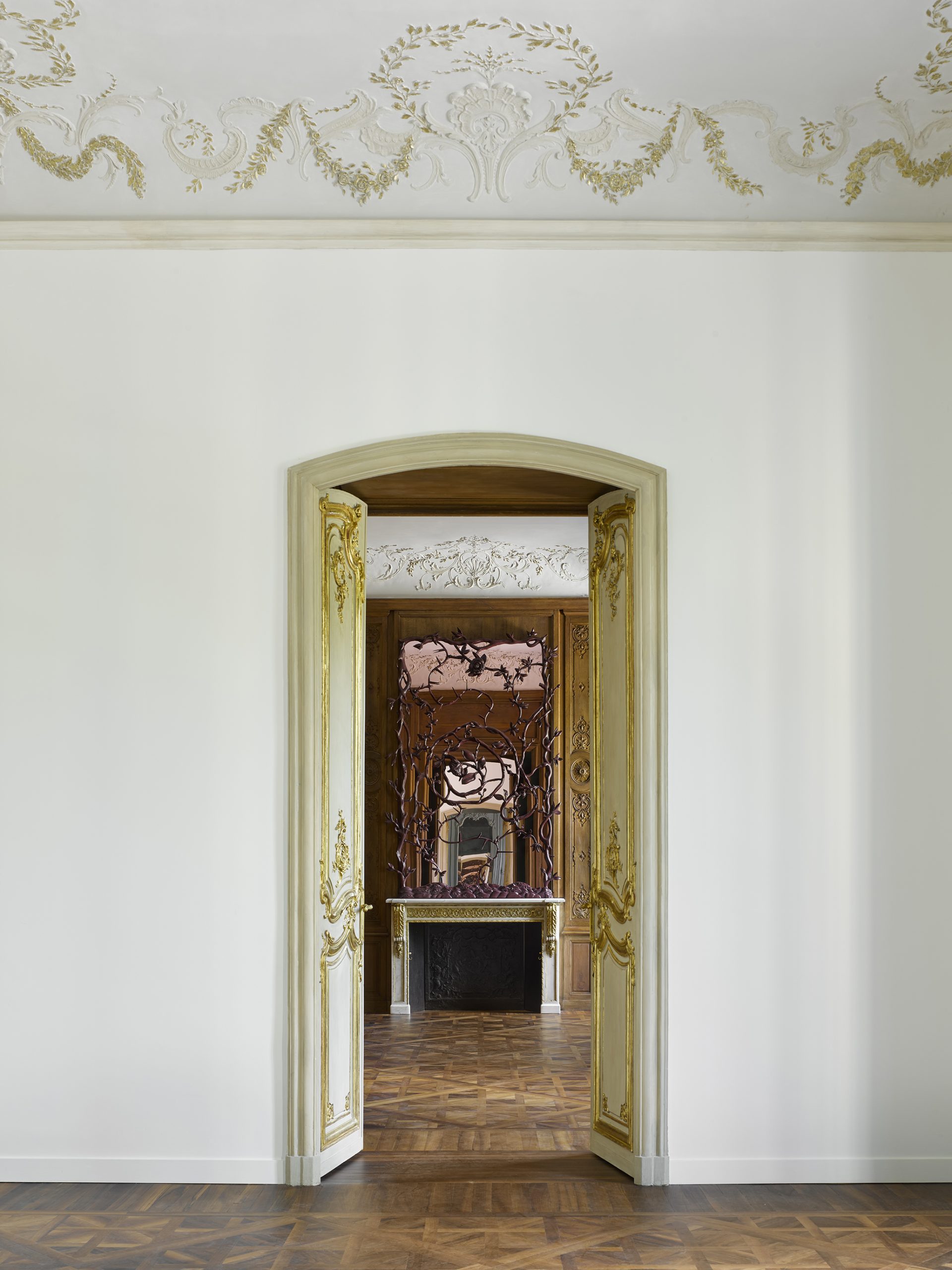 IN THE ARMS ROOM, RESPECTING THE FRAGILITY OF THE ORIGINAL MARBLE FIREPLACE AND THE PERIOD BOISERIE.