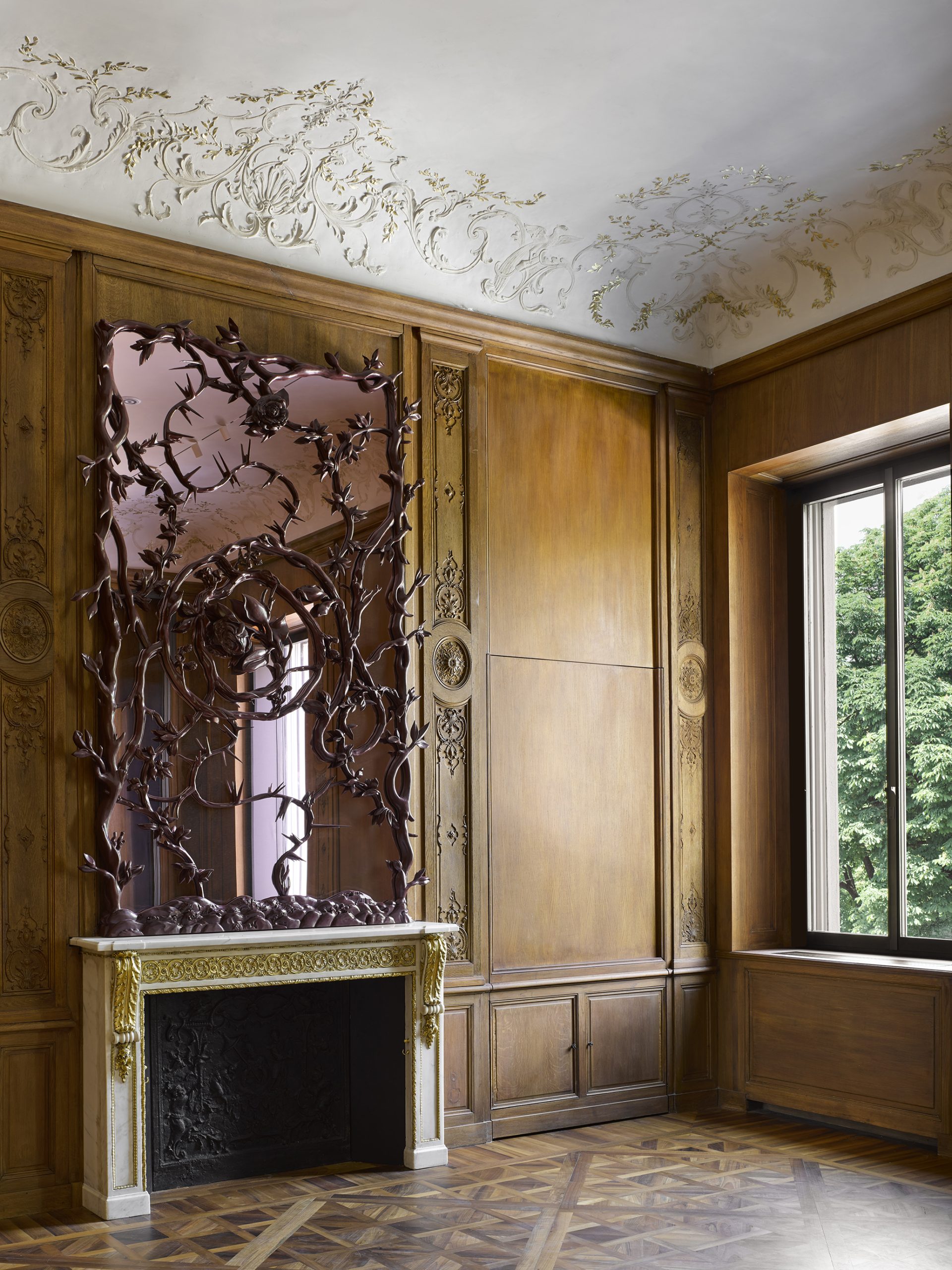 THE MIRROR PLATE GLASS, WITH ITS CUSTOM ROSE COLORATION, IS AN EVOLUTION OF A TRADITIONAL MERCURY GLASS MIRROR, CREATED BY A GLASS MASTER RESTORER, WHO HAS WORKED ON THE MOST IMPORTANT HISTORIC EUROPEAN MIRRORED ROOMS OF THE XVIII CENTURY. THIRTY-EIGHT INDIVIDUALLY SHAPED GLASS MIRRORS WERE CREATED TO GIVE THE ILLUSION OF ONE LARGE MIRROR PLATE, AND THEY HAVE BEEN INSERTED IN THE BACK-STRUCTURE, IN PAIRING INLAID SHAPES BEFORE ALL THE CARVED SECTIONS HAVE BEEN JOINED TOGETHER.